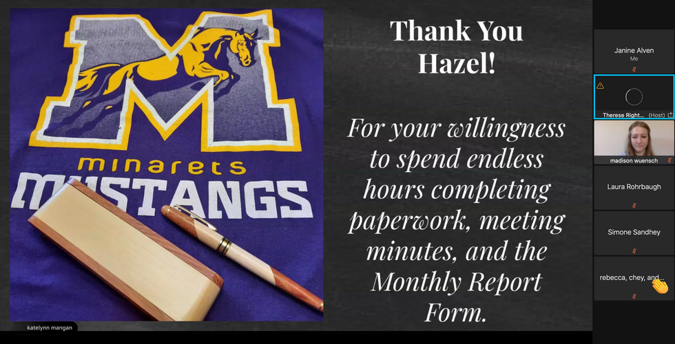 With these challenges, Key Club made it work. With numerous virtual, at-home service opportunities as well as the launch of their website, Key Club thrived during the pandemic. They held 4 fundraisers, Key Club Kares (used to give donations of school supplies to those students in need), Boo Grams (raised money for Unicef's Eliminate program), Valentine Grams (raised money for the Ronald McDonald House), and Kids Day (raised money for Valley Children’s Hospital). They also started one of the biggest projects the Minarets Key Club has ever done: Tutor Time, a virtual service that offered free tutoring to all the students in the Chawanakee Unified School District. Several students were recognized at Installation Night for their hard work at these events. Sophomore Katelynn Mangan and freshman Acacia Edeluchel won awards for the highest number of hours served this year. Former president of the club, senior Madison Wuensch, received a personalized gavel while former secretary, junior Hazel Taintor, was the recipient of a pen.